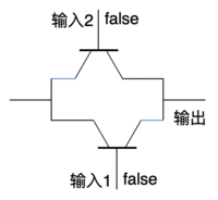 - 如果两个输入的值为 false 时,那么上半部分电路经过「Not门」结果为 true,下半部分为 false,经过最后的「And门」导致结果为 false