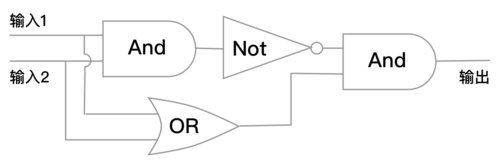 - 如果两个输入的值不一样,那么上半部分电路经过「Not门」结果为 true,下半部分也为 true,最后的「And门」结果为 true