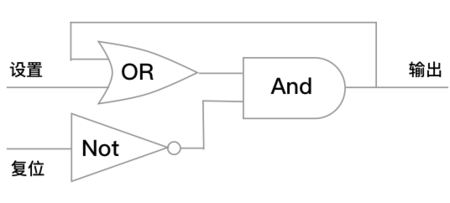 这次好了,设置端通电 1 就存起来了,想存 0 就给恢复端通电,这样我们就简单实现了一个能存储一个 bit 的电路。但是我们还会发现一个问题就是存 1、0 的状态需要两个线分别去处理,这样就会有很多不便。我们继续往下看来解决这个问题。