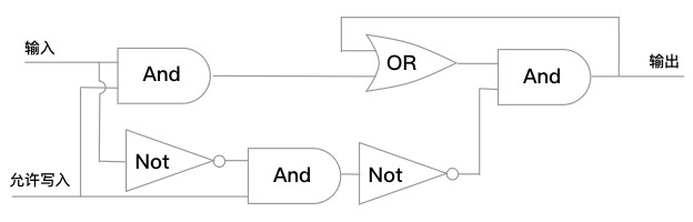 这样一来我们就可以用一根线控制锁存器的状态,并且添加了允许写入的线来控制切入权限。这样一来存一个 bit 的电路我们就完成了。下面我们来组合一下。
